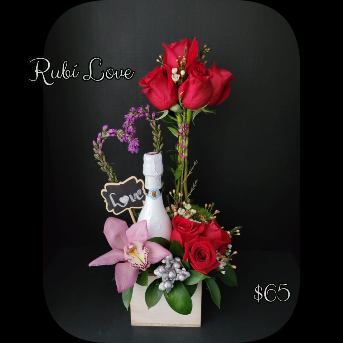 RUBI LOVE! Hermoso detalle en ROSAS, ORQUIDEAS Y LIATRIS acompanado de un Vino Espumos. \n...